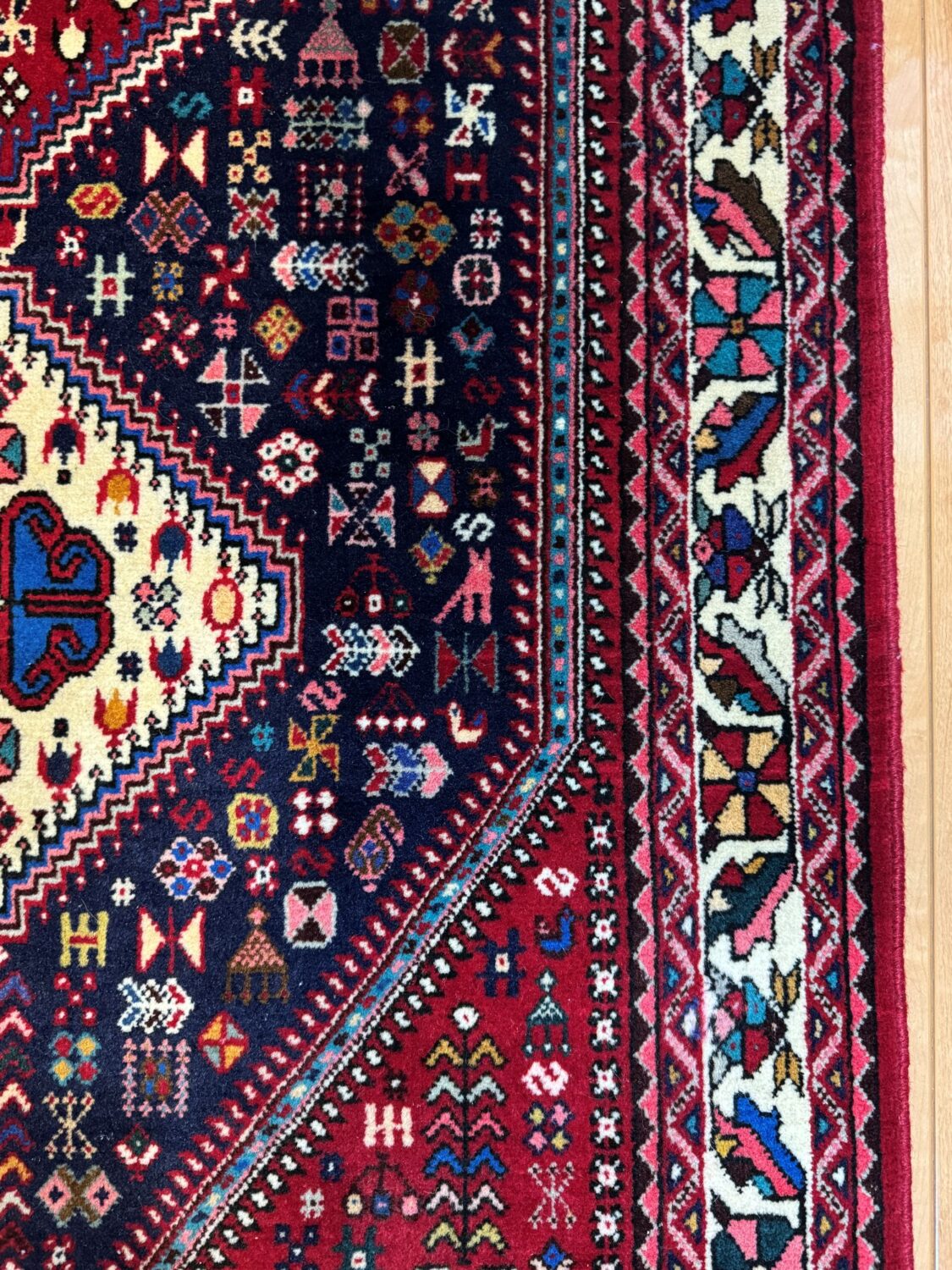 アバデ絨毯らしい深みのある赤を基調に、連なるメダリオン文様と細やかなモチーフがリズミカルに配置された一枚です。織りはしっかりと目が詰まり、日常的に立つ時間の長いキッチンでも安心してお使いいただけます。ウールは踏み心地が柔らかく、それでいて耐久性にも優れているため、使い込むほどに風合いが増していくのも魅力です。