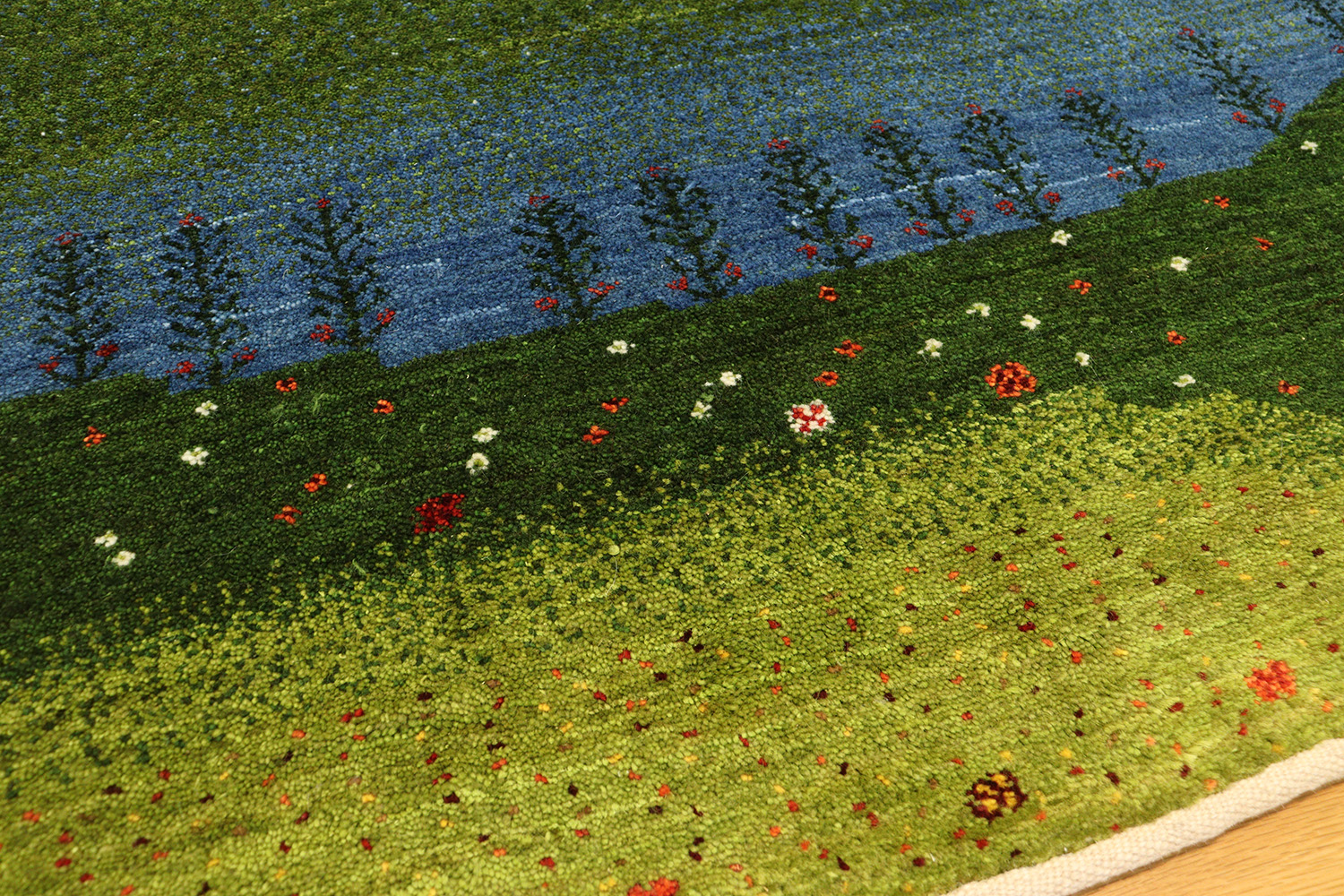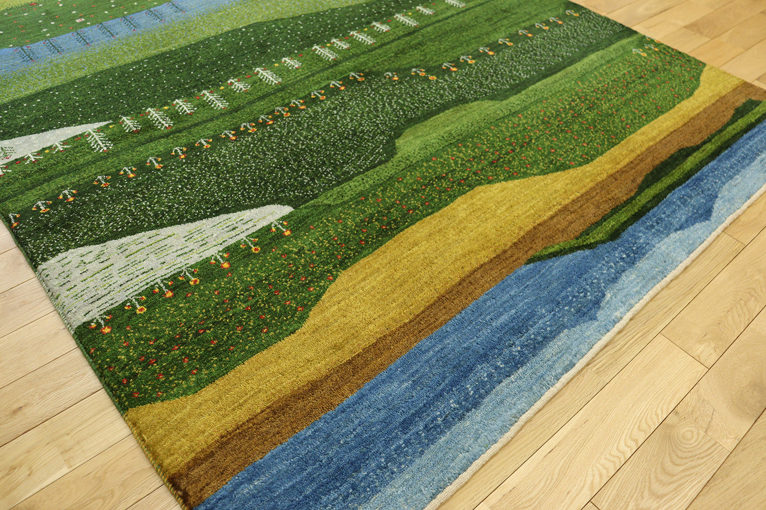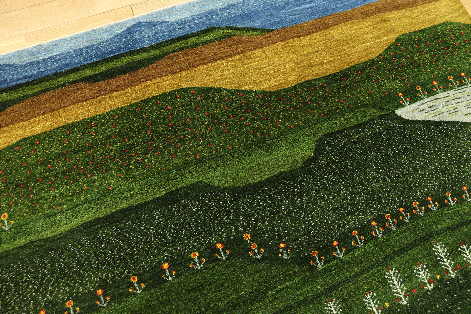 草原や丘陵、遠景の空までを一枚の中に織り上げた、珍しい風景文様。層を重ねるように表現された緑の濃淡は、見る角度や光の当たり方によって表情を変え、まるで季節の移ろいを感じさせるような奥行きを生み出しています。点在する小さな花々や樹木のモチーフは、遊牧民の暮らしの中で見てきた自然の記憶を象徴的に表したものであり、素朴でありながらも詩的な世界観を感じさせます。