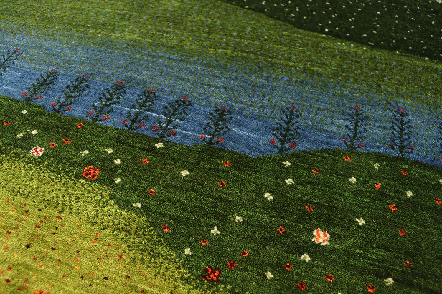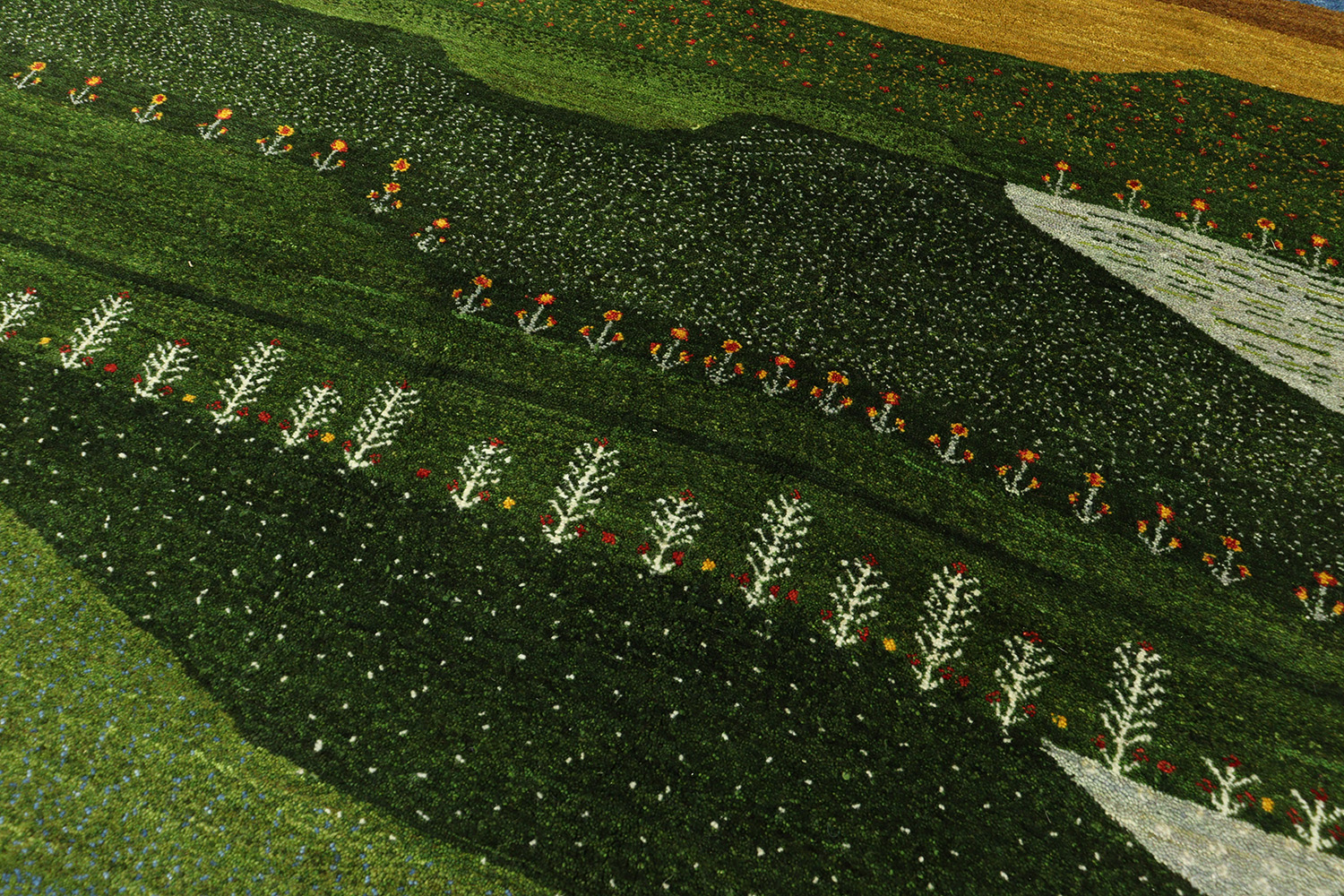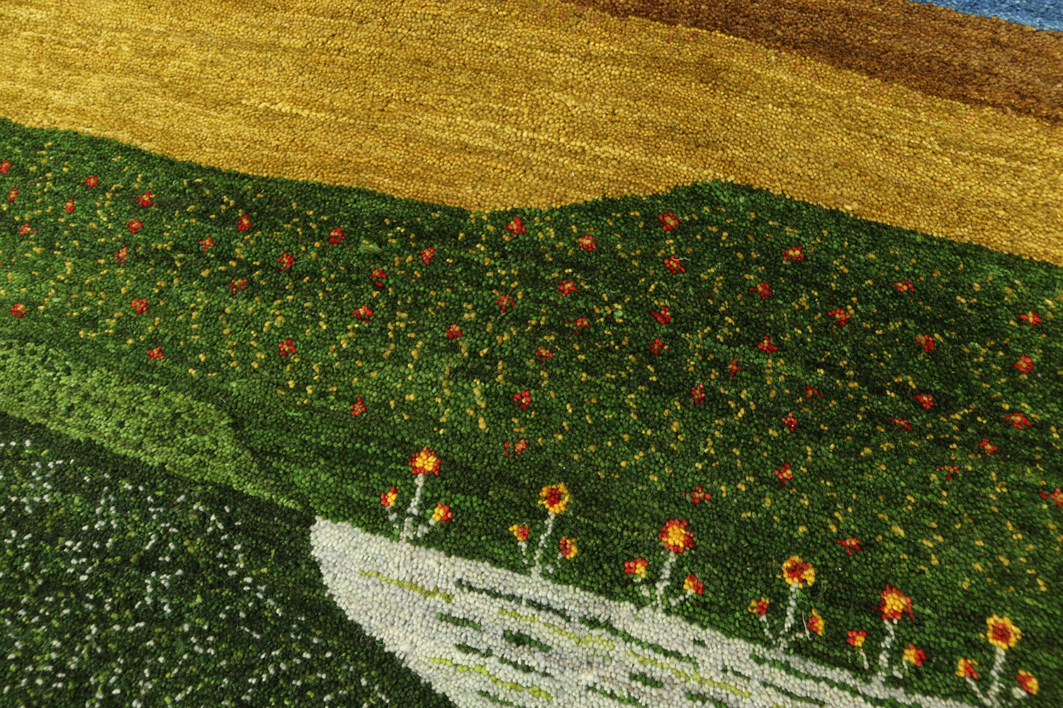 草原や丘陵、遠景の空までを一枚の中に織り上げた、珍しい風景文様。層を重ねるように表現された緑の濃淡は、見る角度や光の当たり方によって表情を変え、まるで季節の移ろいを感じさせるような奥行きを生み出しています。点在する小さな花々や樹木のモチーフは、遊牧民の暮らしの中で見てきた自然の記憶を象徴的に表したものであり、素朴でありながらも詩的な世界観を感じさせます。