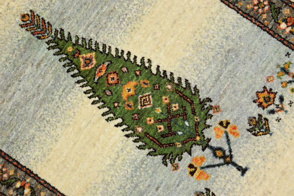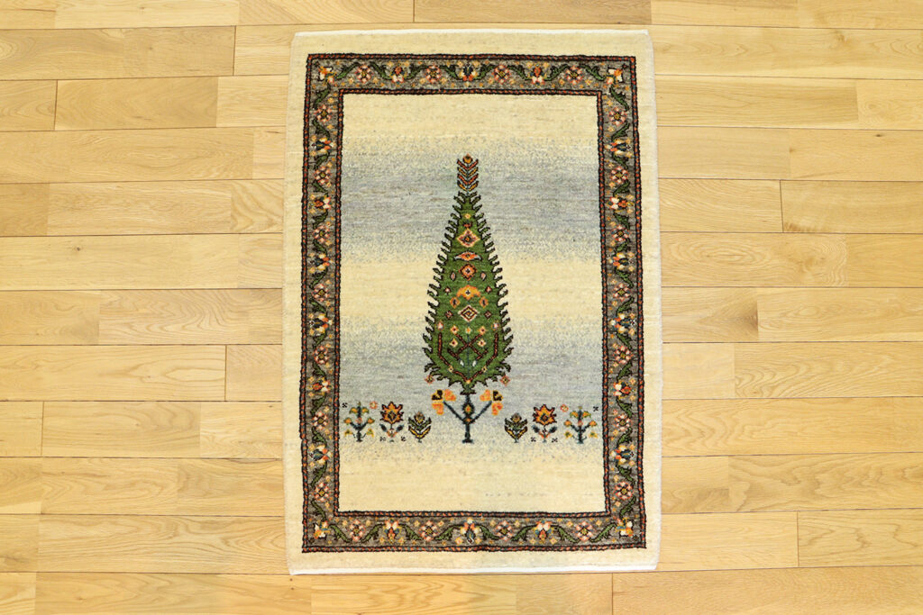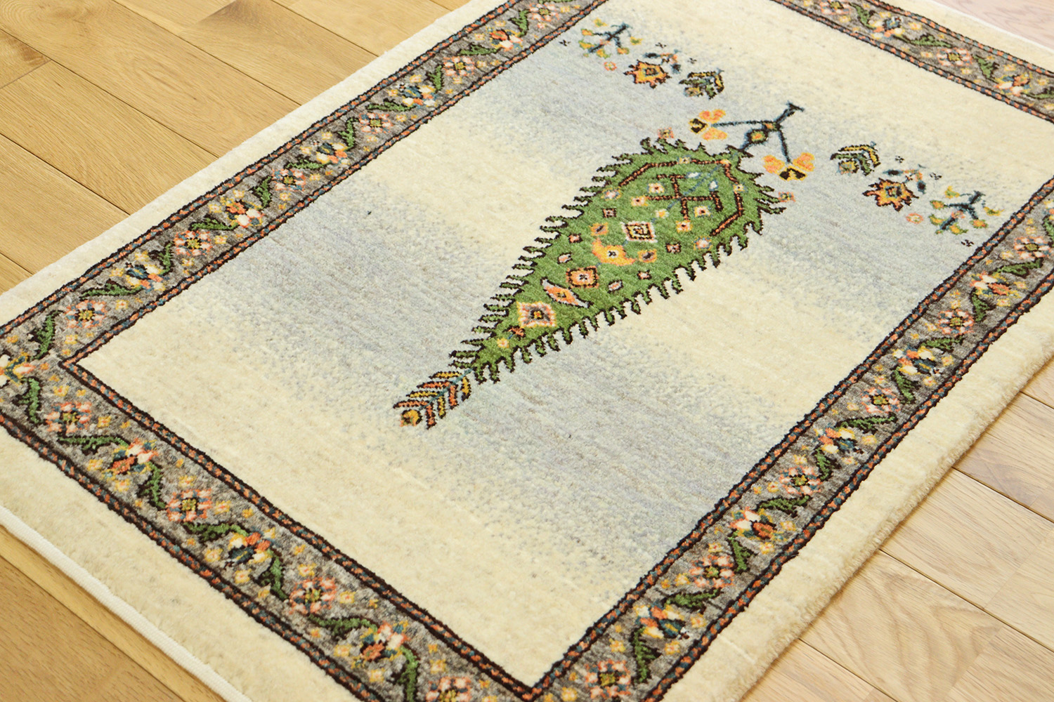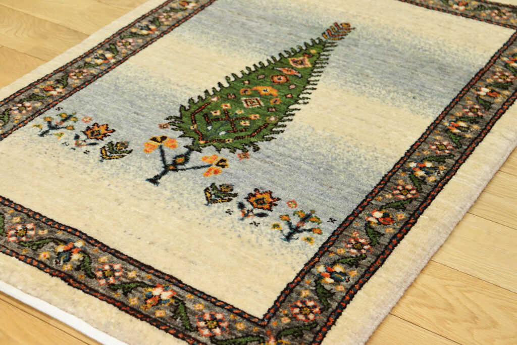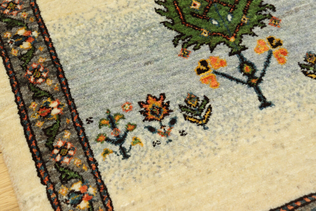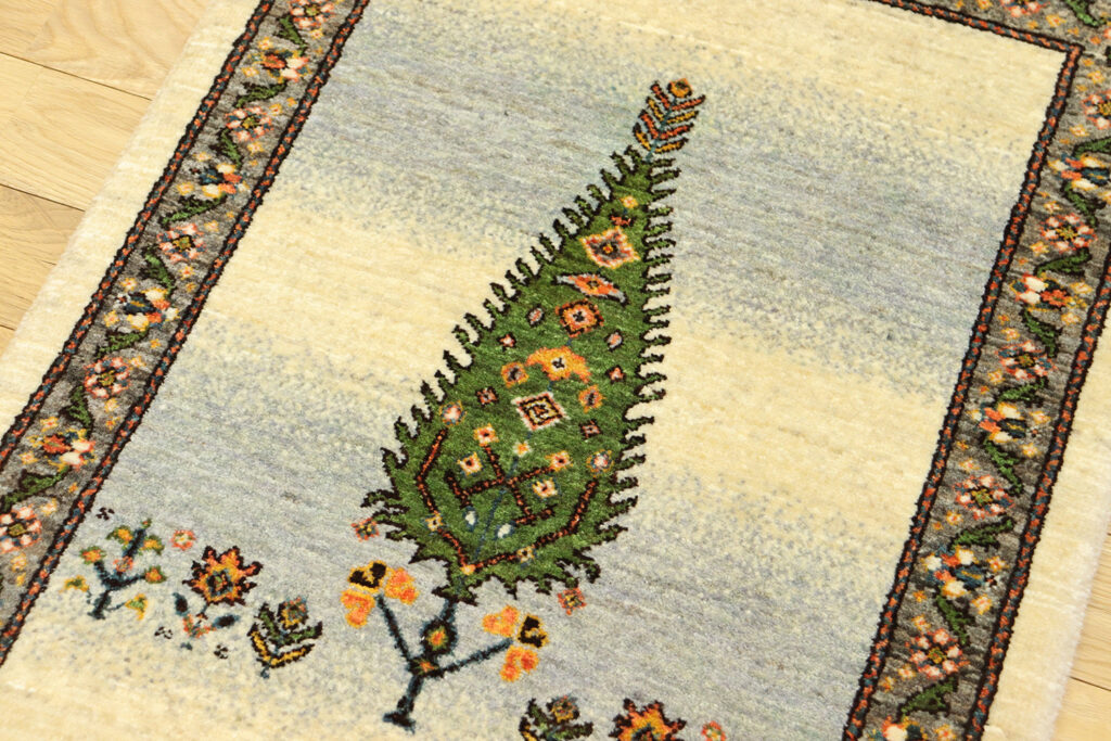 「ルリバフ」は、ギャッベの中でも特に織密度が高く、細やかな意匠表現が可能なグレードとして知られています。本作においても、中央に配された生命の木のモチーフや周囲の草花文様が端正に織り上げられ、手仕事ならではの柔らかな揺らぎと整然さが美しく共存しています。