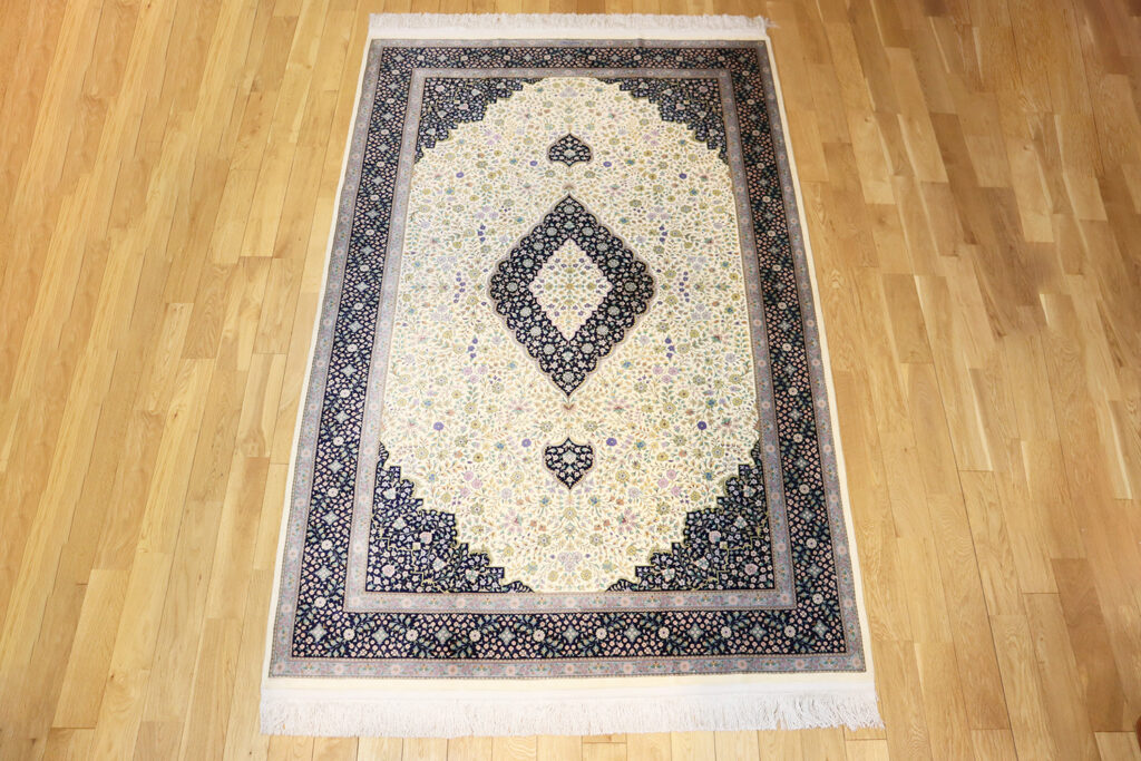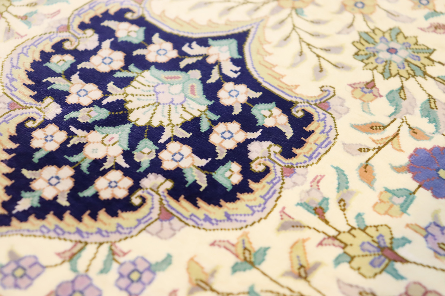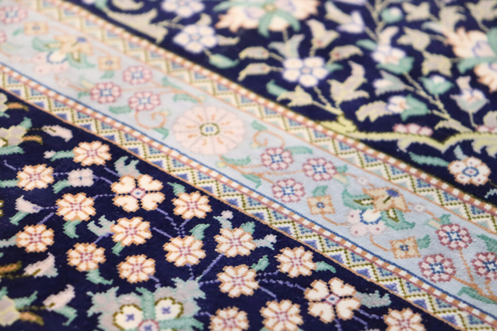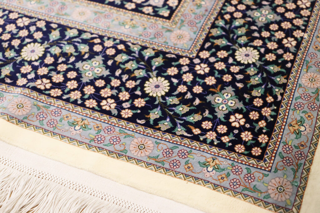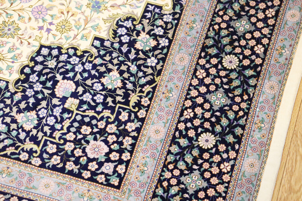 クムは世界的にもシルク絨毯の名産地として知られ、極めて細かな織りと優雅なデザインで高く評価されています。本作もその伝統を受け継ぐ一枚で、非常に繊細な織りによって草花文様が隙間なく表現された、芸術性の高い作品です。