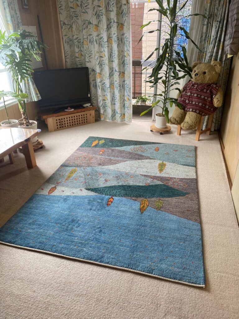 実際にリビングへ敷いてみると、やわらかな光の入る空間の中でブルーのグラデーションが美しく映え、お部屋全体に穏やかな景色が広がるような印象です。