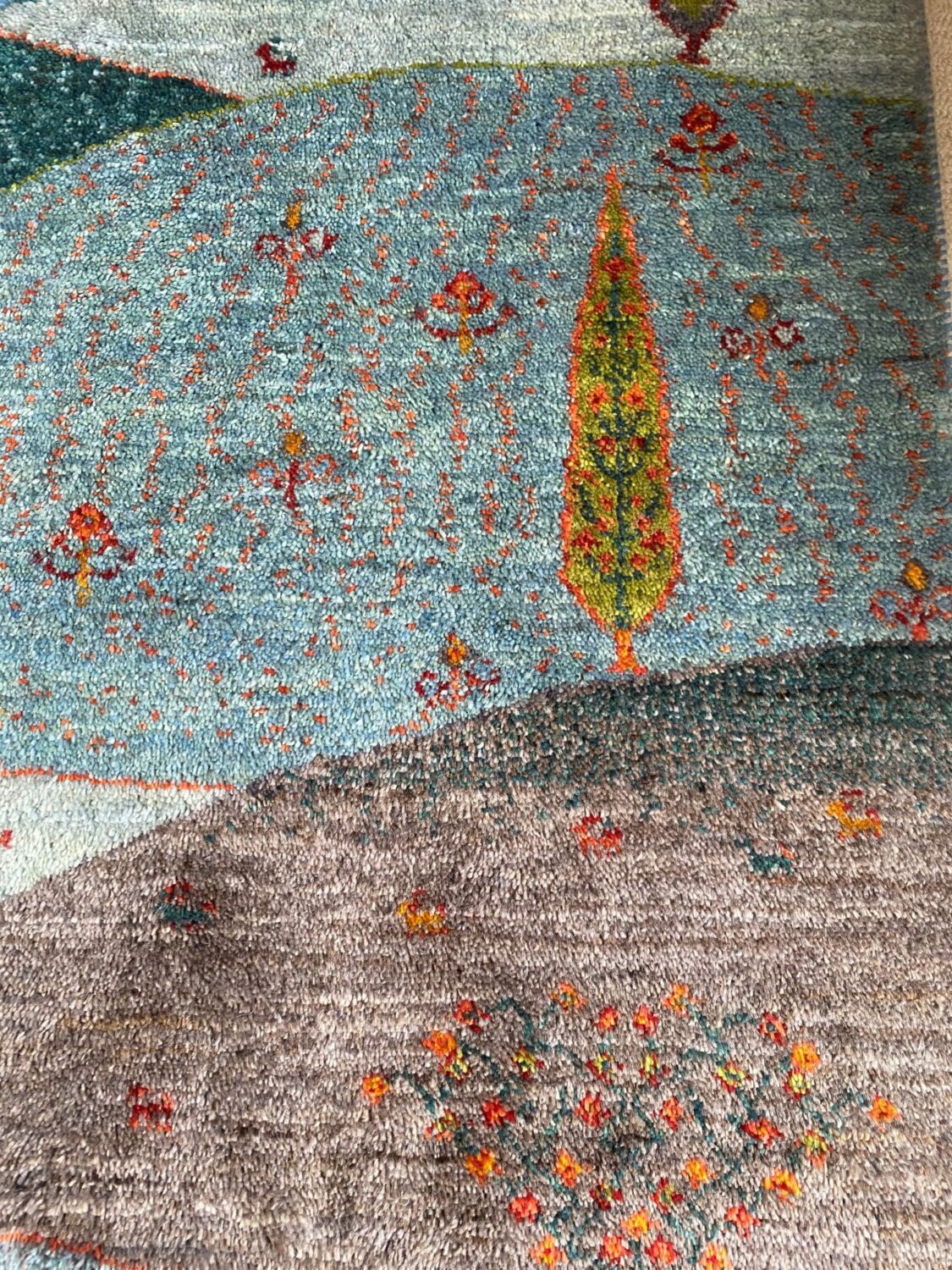 こちらのギャッベは、イラン南西部に広がるザクロス山脈の風景をそのまま絨毯の中に織り込んだような、非常に大胆で美しいデザインが特徴の一枚です。青く広がる空や、なだらかな丘陵、そこに静かに佇む木々の姿が、まるで一枚の風景画のように表現されています。ザクロスの大地を映す一枚