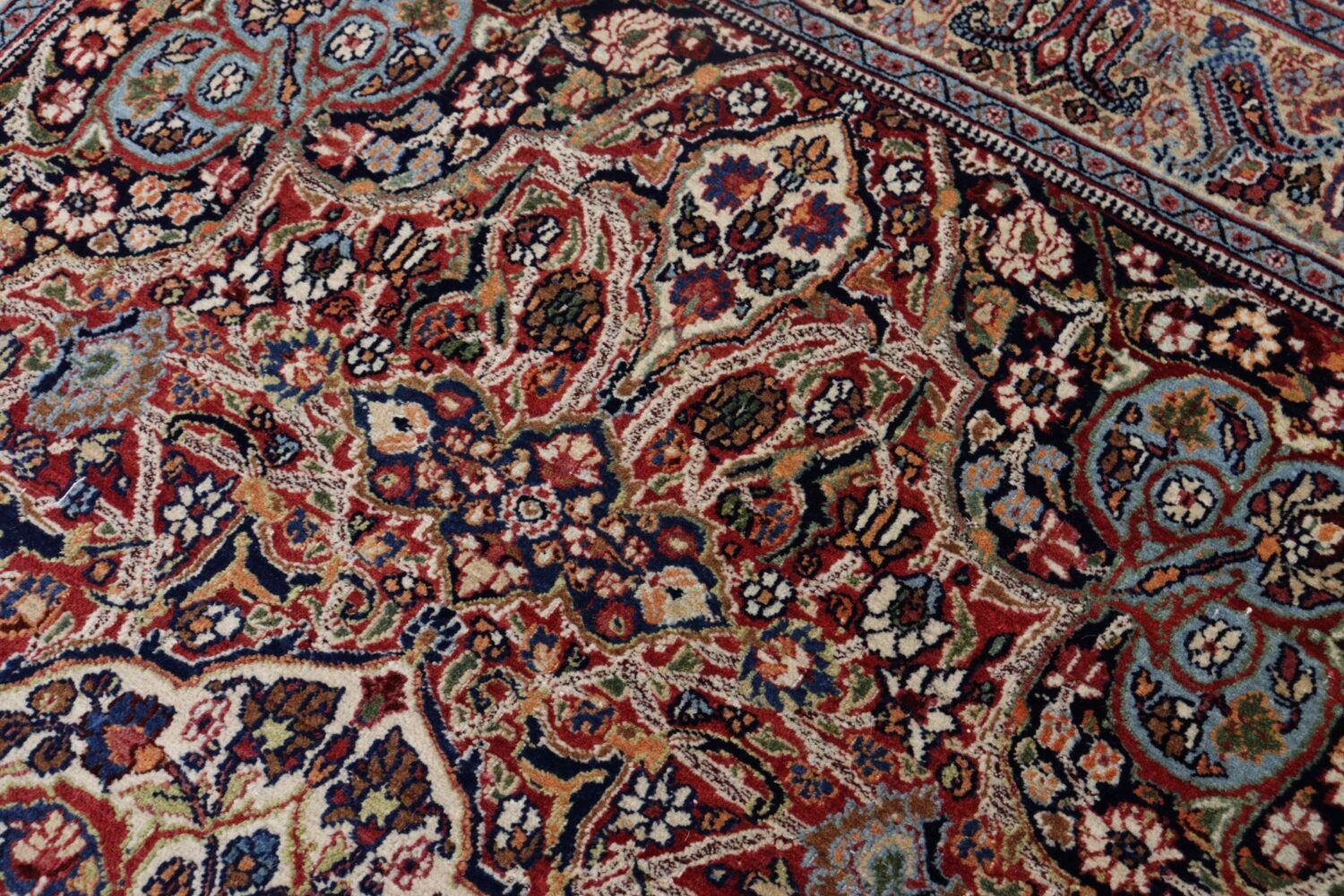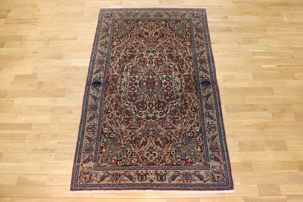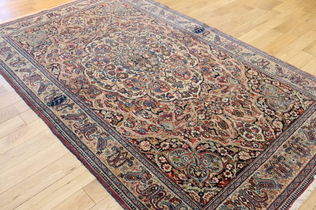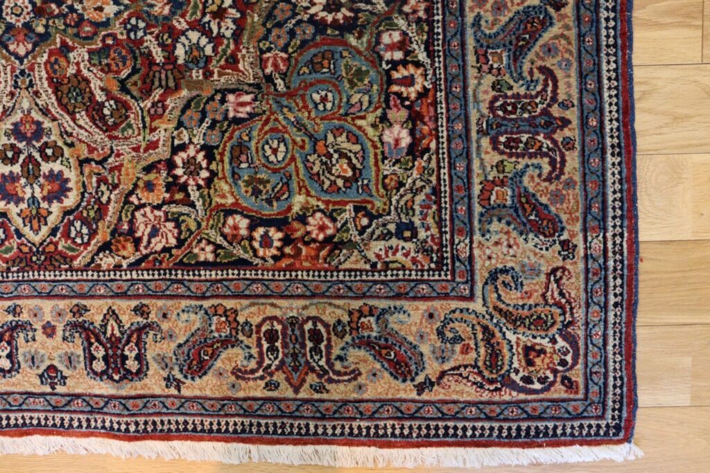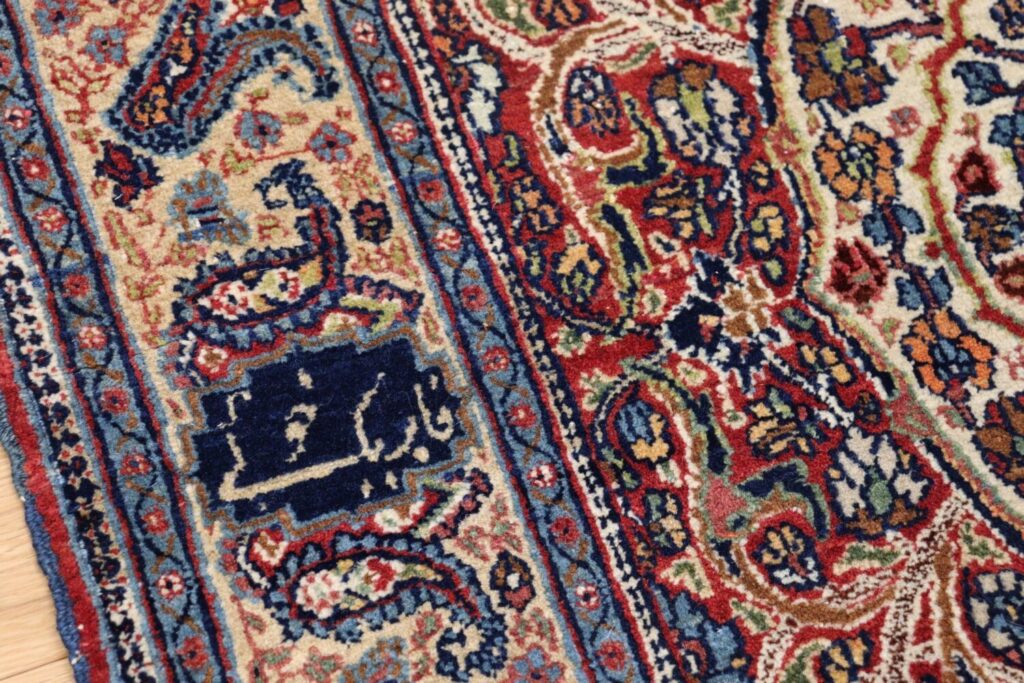 マシュハドの絨毯は、堂々としたメダリオンデザインと、細やかな花文様が重なり合う優雅な意匠で知られています。本作も中央のメダリオンを中心に、生命力あふれる植物文様が隙間なく描かれ、見る角度によって表情を変える深みのある色彩が魅力です。