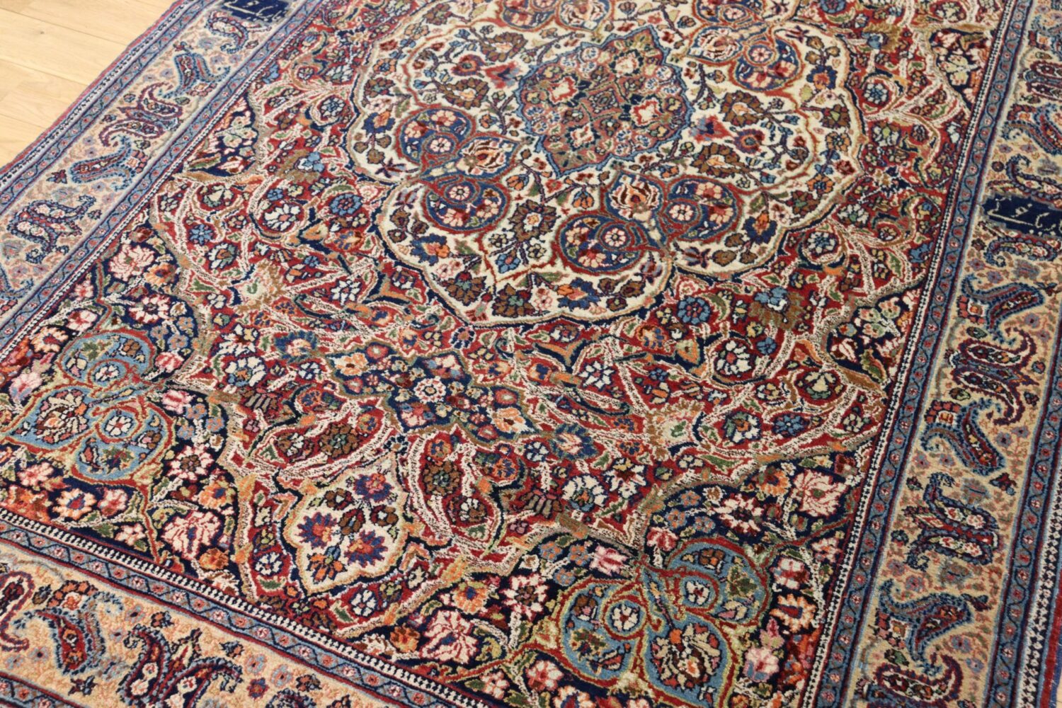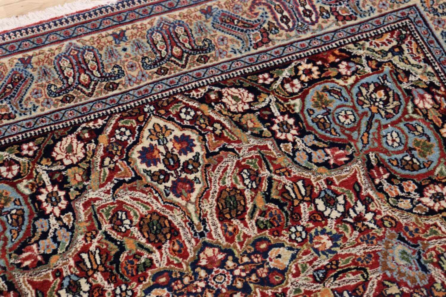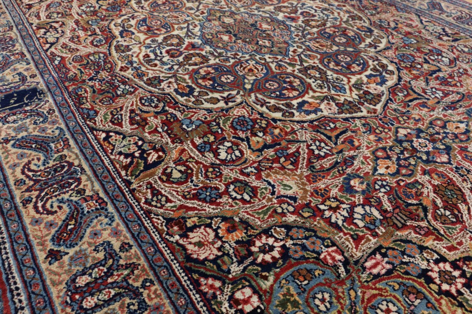 マシュハドの絨毯は、堂々としたメダリオンデザインと、細やかな花文様が重なり合う優雅な意匠で知られています。本作も中央のメダリオンを中心に、生命力あふれる植物文様が隙間なく描かれ、見る角度によって表情を変える深みのある色彩が魅力です。