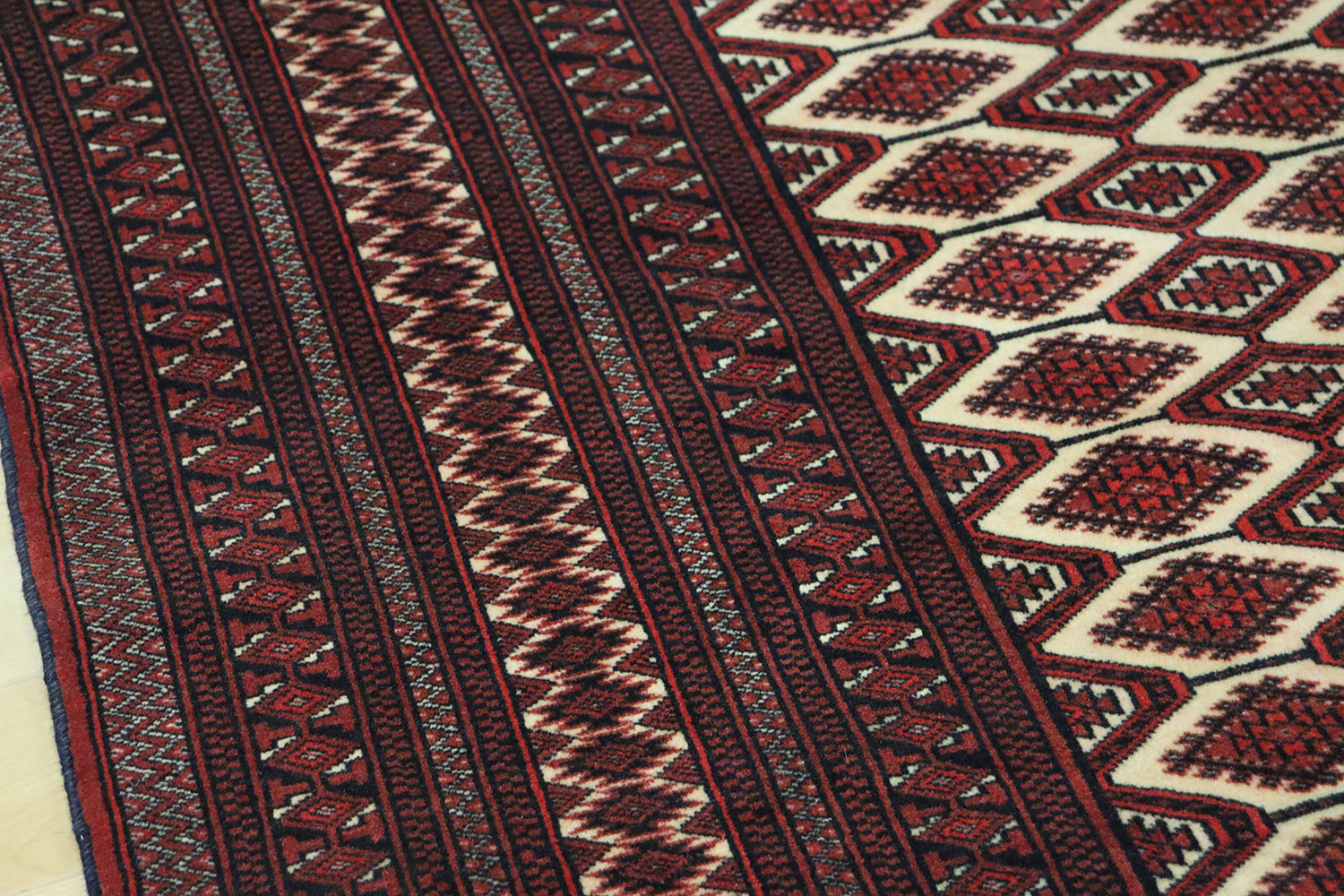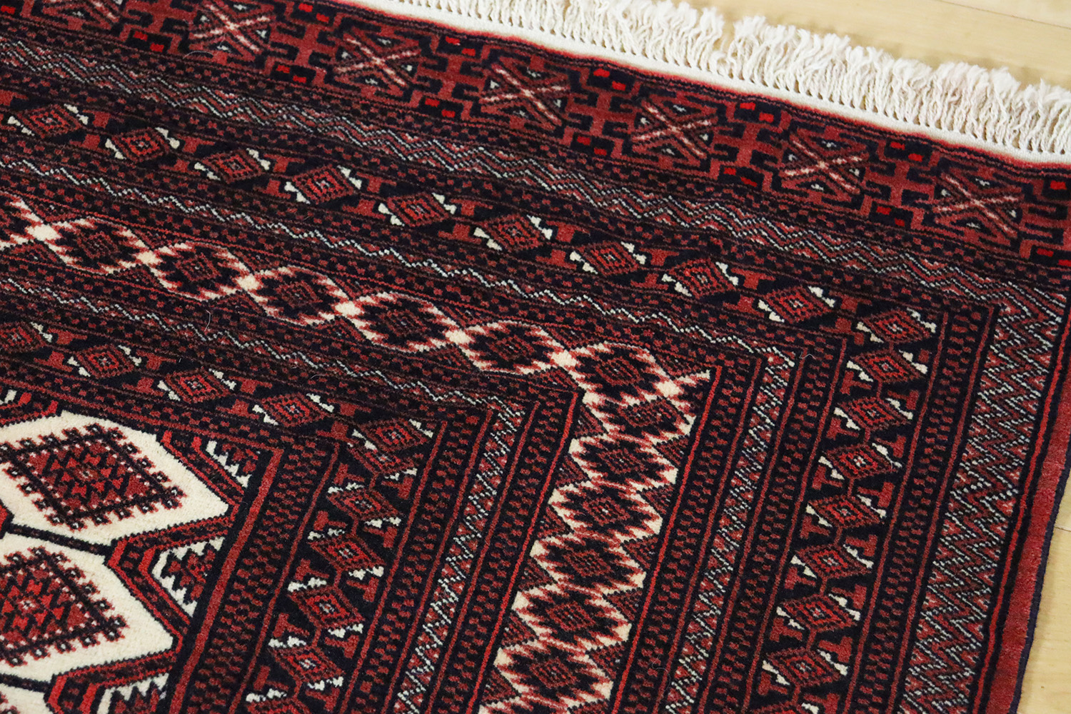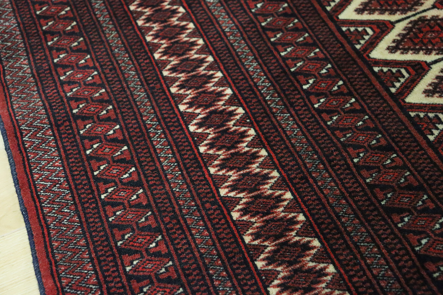 深みのあるレッドを基調に、規則的に並ぶ幾何学文様が美しく、伝統的なトゥルクメンデザインの気品と力強さを感じさせる一枚です。