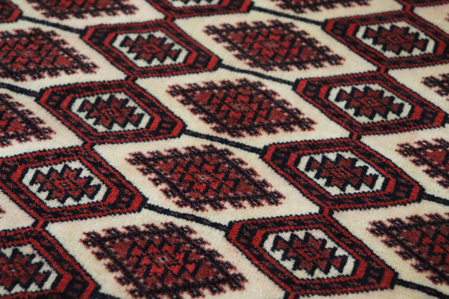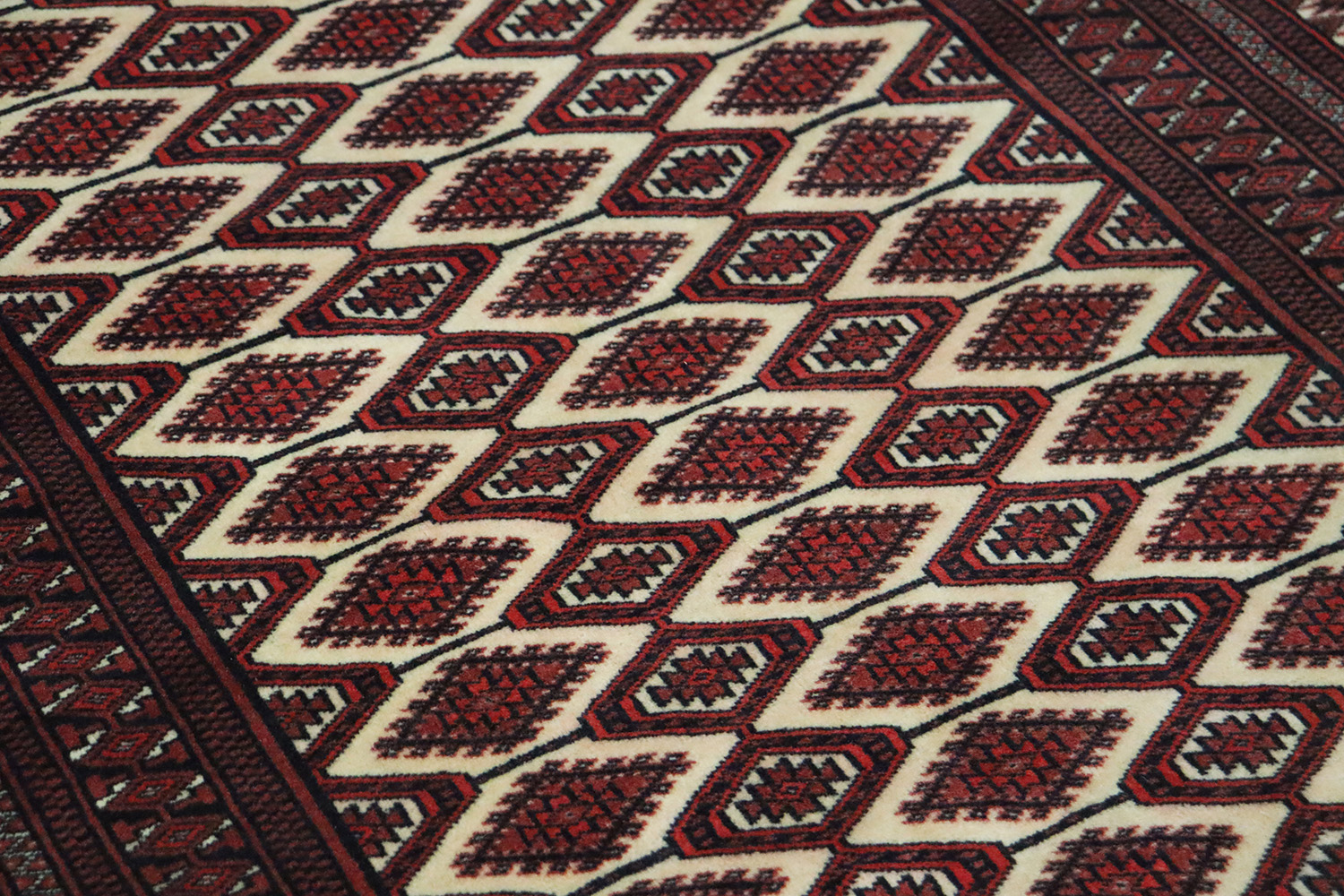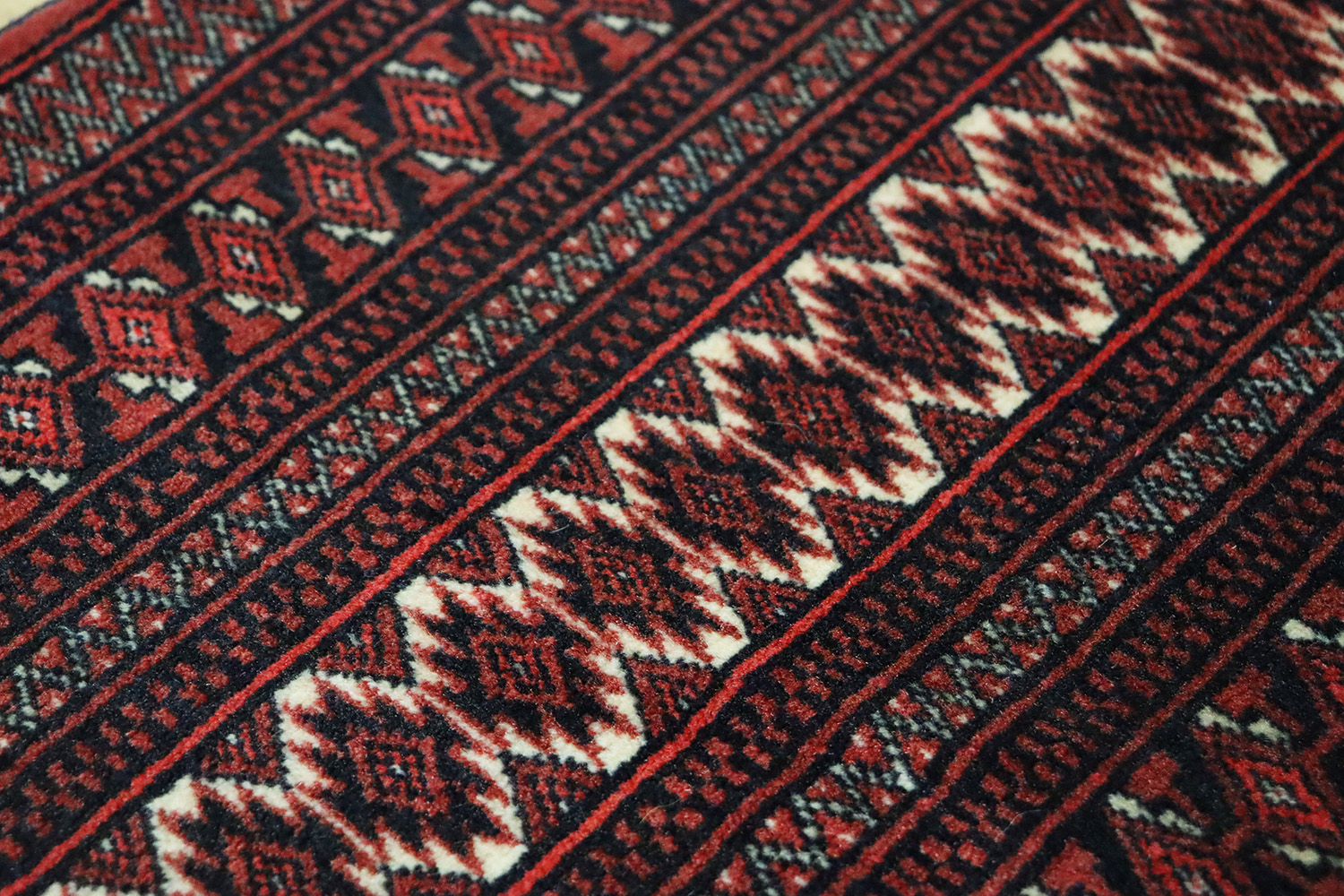 深みのあるレッドを基調に、規則的に並ぶ幾何学文様が美しく、伝統的なトゥルクメンデザインの気品と力強さを感じさせる一枚です。