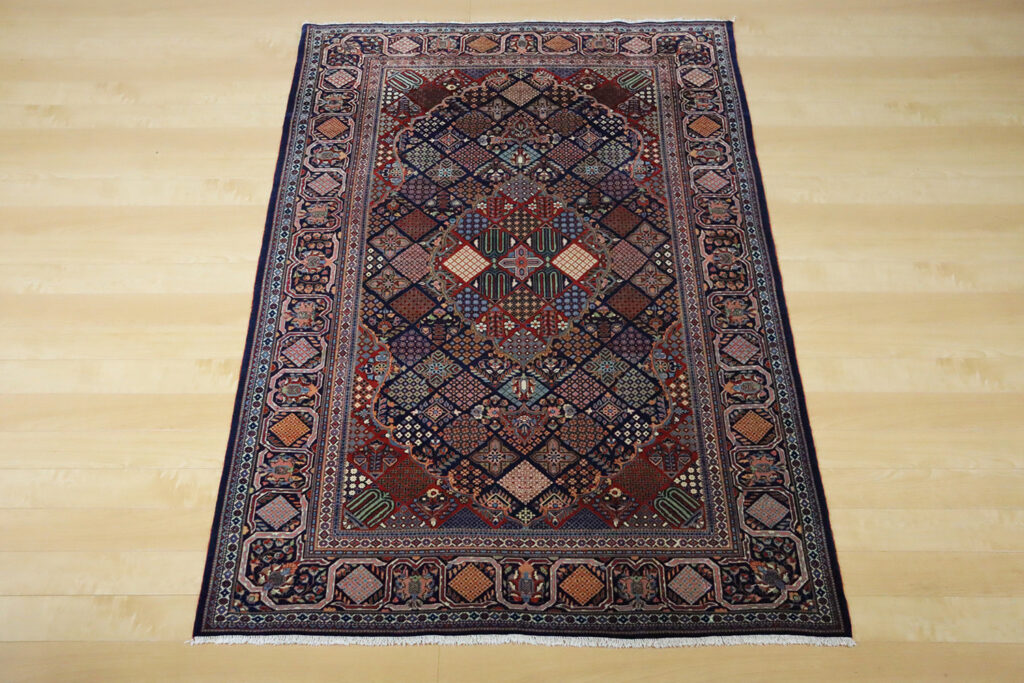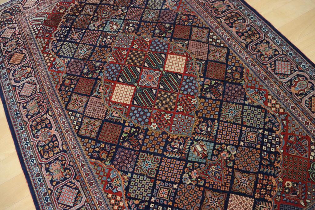 本作は約100年前に織られたアンティークの逸品で、サイズは185×132cm。まさにジョーシャガンの代表的な意匠である「連続するダイヤモンド文様」が全体を支配しています。それぞれの菱形の中には、バラやカーネーションを思わせる小花や樹木が規則正しく配され、まるでモザイク画のように緻密な美しさを放っています。このデザインは、伝統を大切にするジョーシャガンならではの特徴であり、現代に至るまで大きな変化を受けずに織り継がれてきたデザインです。