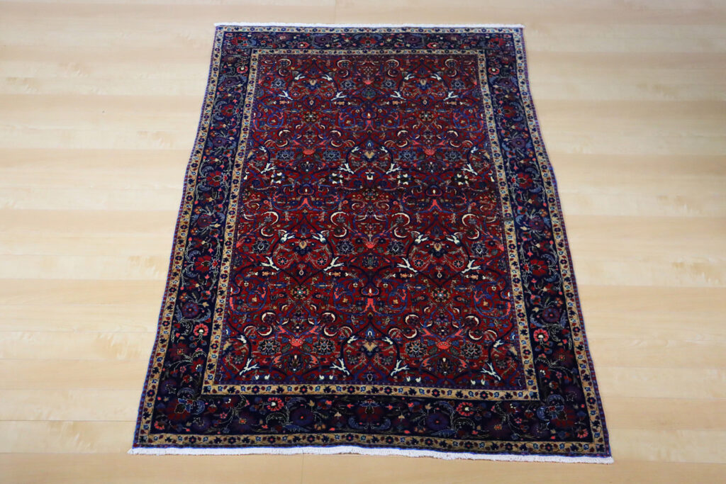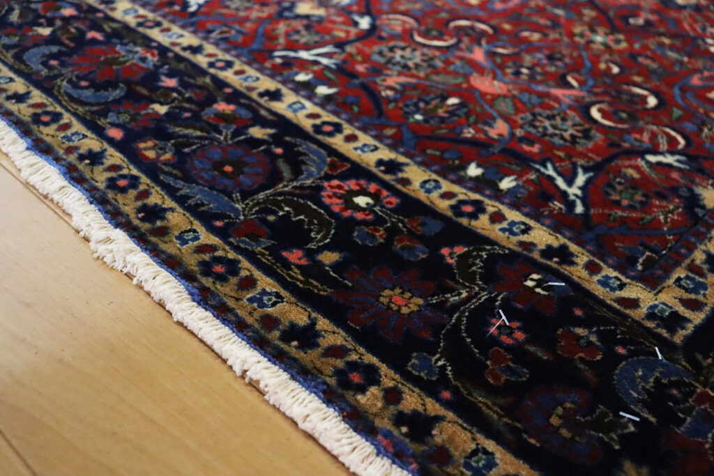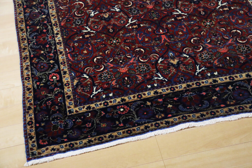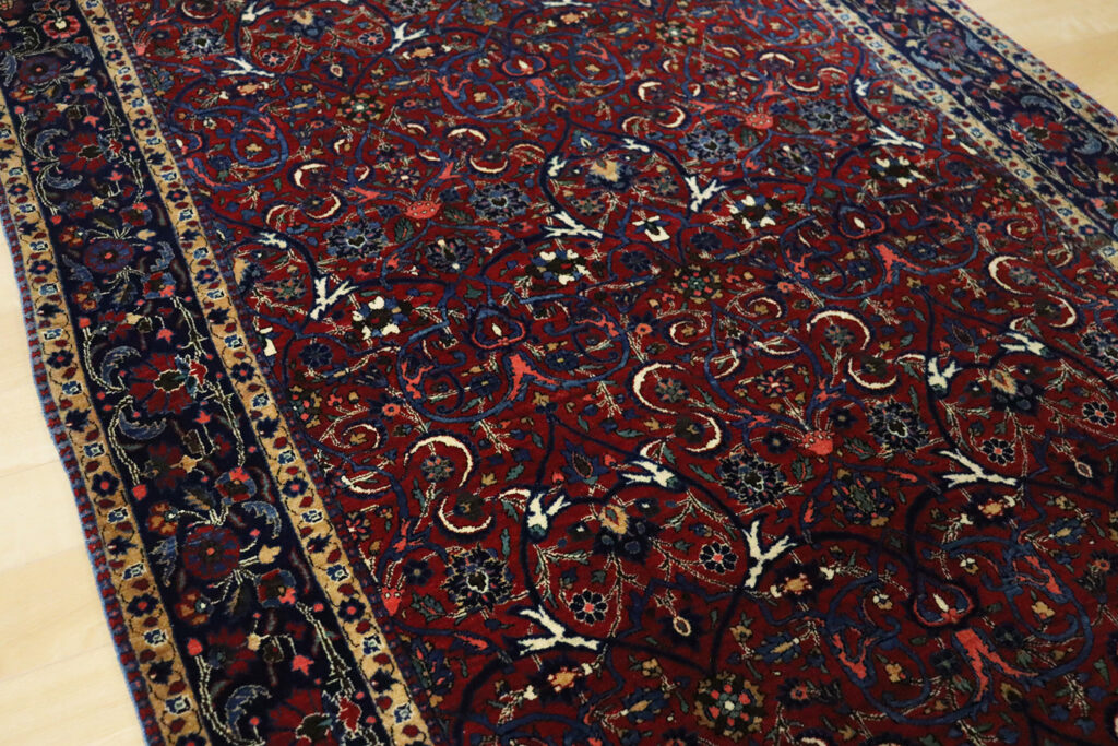 また、この絨毯が織られた20世紀初頭は、ペルシャ絨毯が国際的に高い需要を誇った時代であり、輸出向けに制作された高品質な作品が数多く残されています。100年以上の時を経ても色彩はなお鮮やかに保たれており、羊毛の艶やかな光沢がその価値を物語ります。アンティークとしての希少性と、現在の暮らしに溶け込む実用性を併せ持つ点も、大きな魅力です。