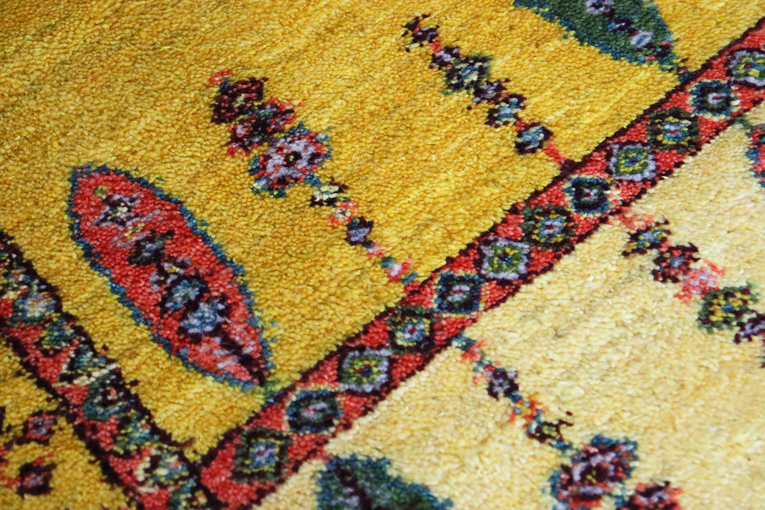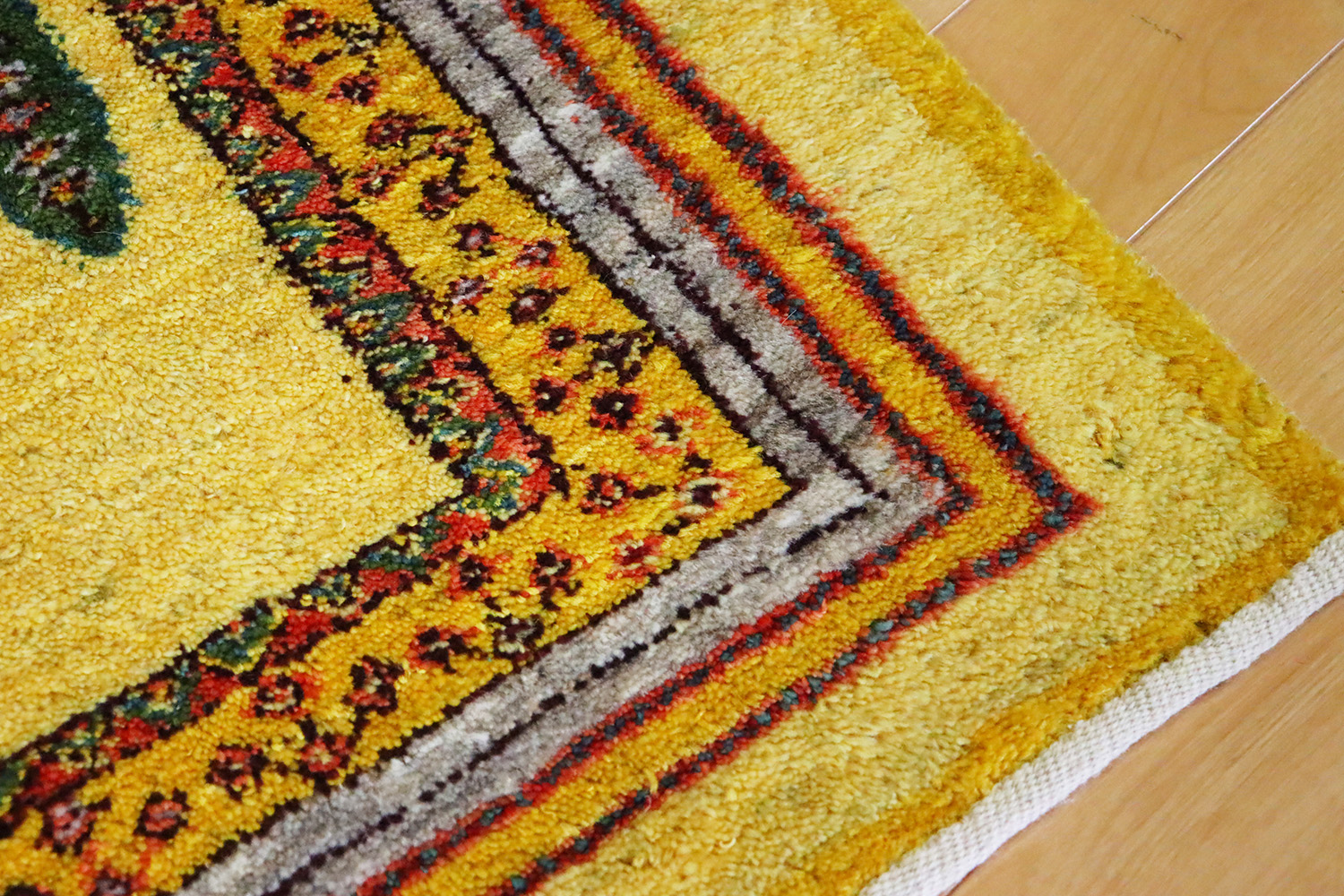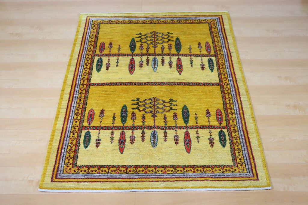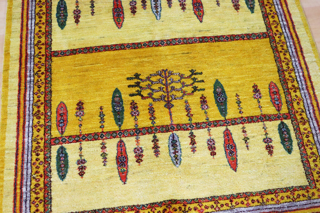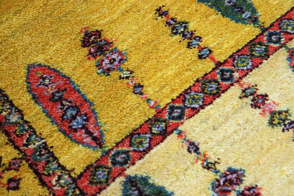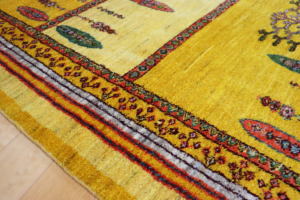 素材は上質な羊毛100%。イラン高原の寒暖差の中で育った羊の毛は油分を多く含み、しっとりとした手触りと自然な艶を持っています。手紡ぎの糸ならではのふっくらとした弾力は、機械織りでは再現できない温かみを感じさせてくれます。染色には植物由来の天然染料が用いられ、特にこの黄色はザクロの皮やウコンなどを用いて草木で丁寧に染め上げられたもの。化学染料にはない深みと優しさが感じられます。