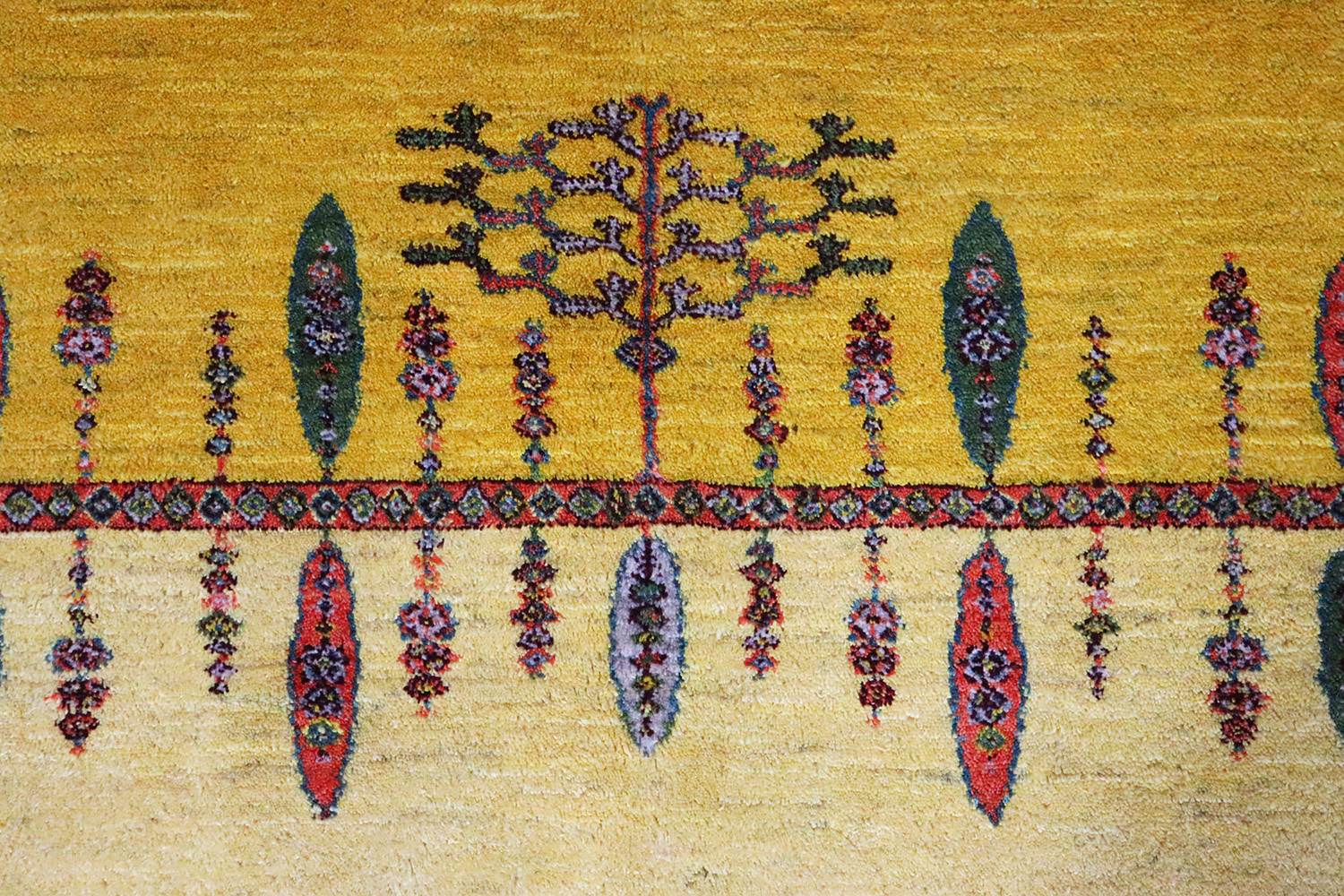 中央には二段に配された「生命の樹」のモチーフ。生命の樹は古来より「繁栄」「長寿」「家族の絆」を象徴する文様とされ、遊牧民にとっては日々の祈りや自然への感謝を表す大切な意味を持ちます。その周囲には、赤や緑で表現された楕円形の文様が整然と並び、自然の恵みである果実や種子を思わせます。幾何学的でありながら温もりを感じさせるその構成は、熟練の織り手の確かな感性の証です。