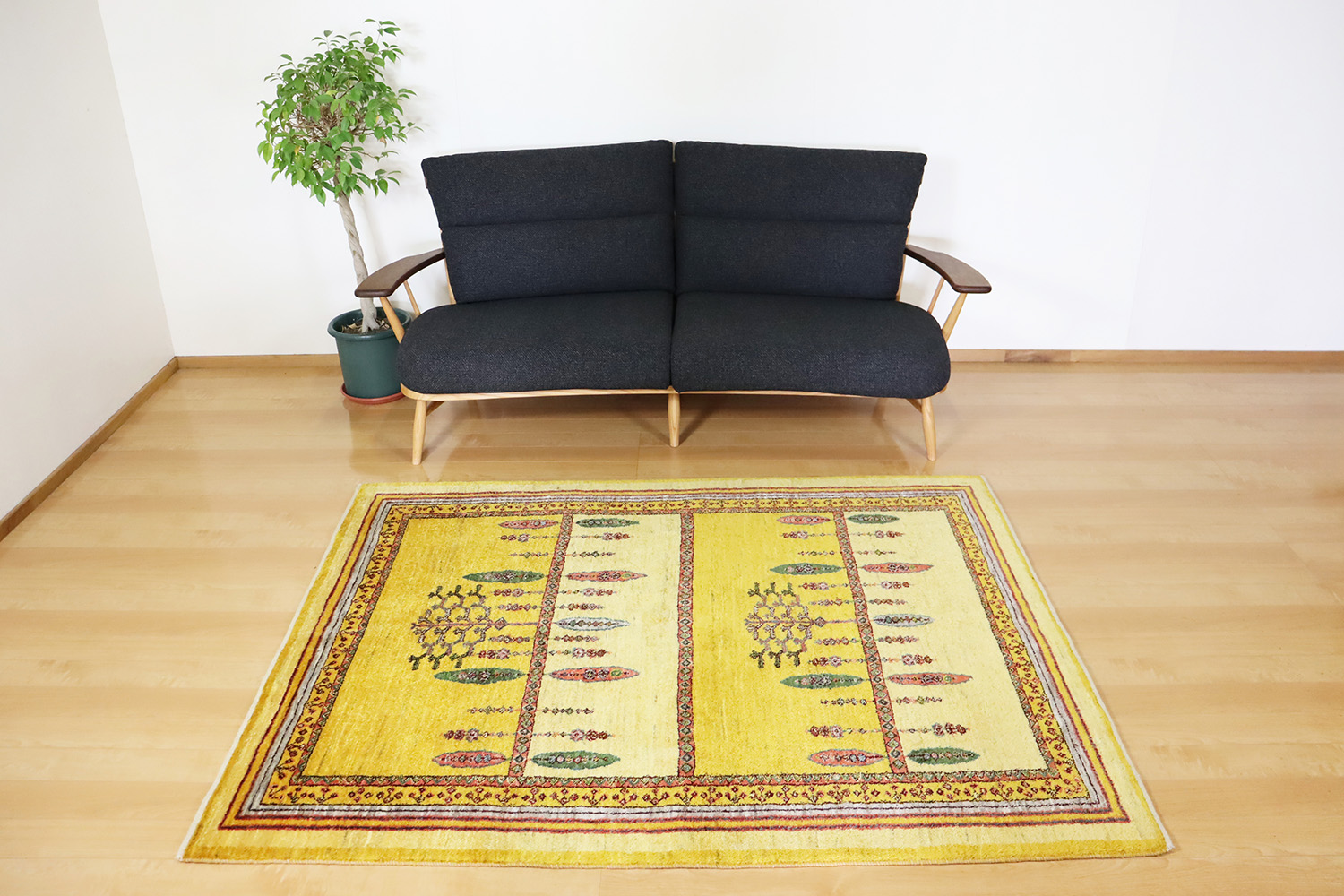 189×150cmというサイズは、リビングの中心やダイニングテーブルの下にも程よく収まります。人気のイエローギャッベ、只今当店に展示中です。