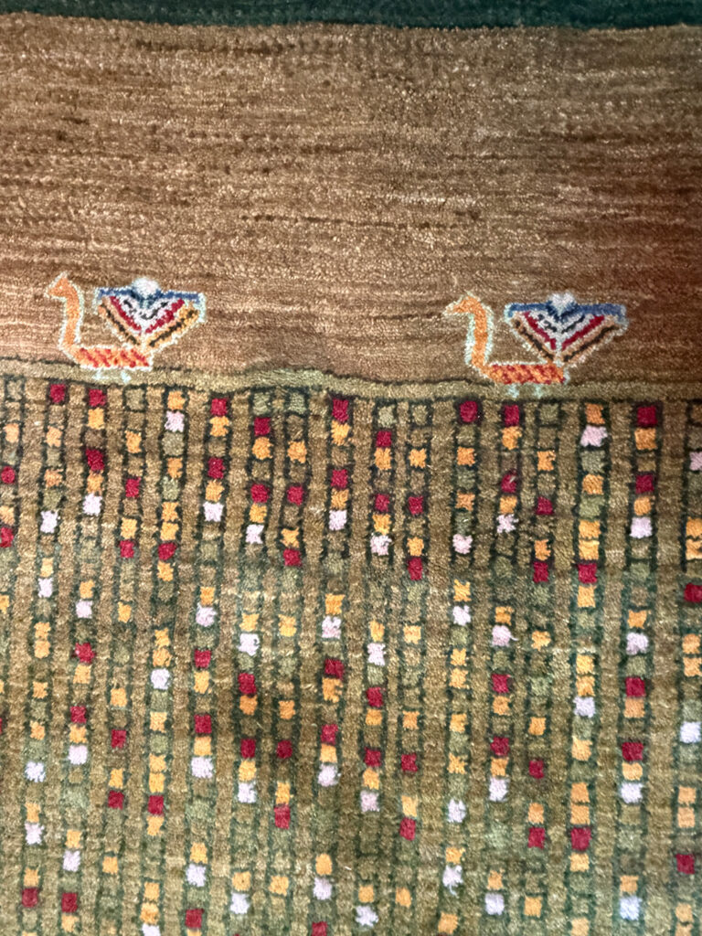 さらに、このギャッベの大きな特徴が、枝の上に織り込まれた「孔雀」のモチーフ。孔雀は美や繁栄を象徴し、邪気を祓う縁起の良い存在として、イランでも特別視されています。緑の大地に輝くようなカラフルな孔雀が加わることで、1枚のラグが物語性を持ち、空間に特別なアクセントを与えてくれます。