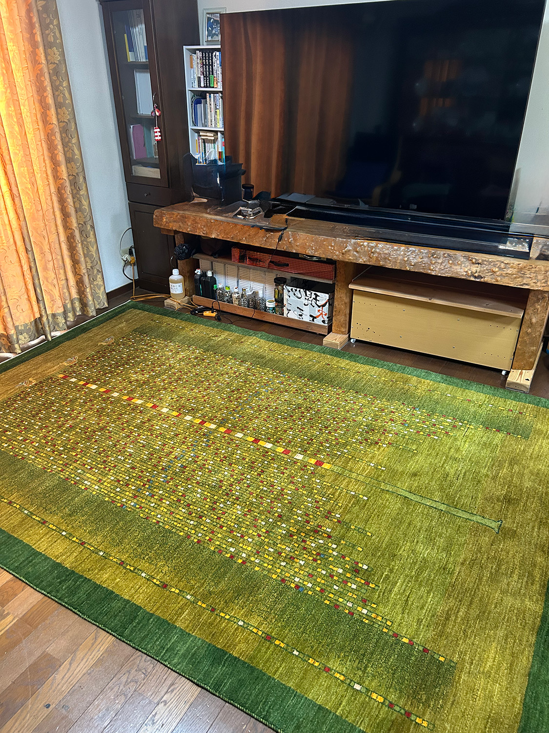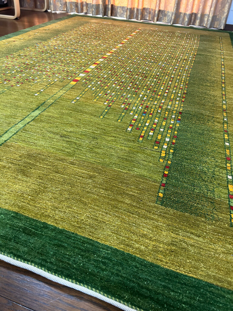 広々としたリビングに敷いた瞬間、空間全体が柔らかな緑に包まれ、自然の中にいるような安らぎとギャッベ特有の手織りの温かさが一気に広がりました。