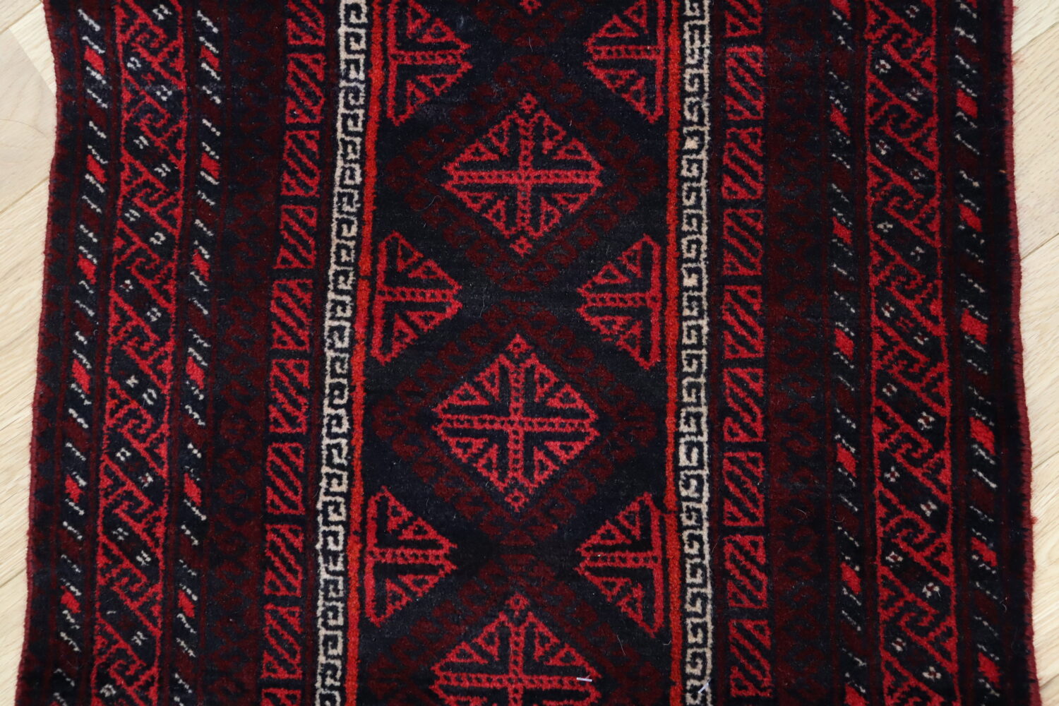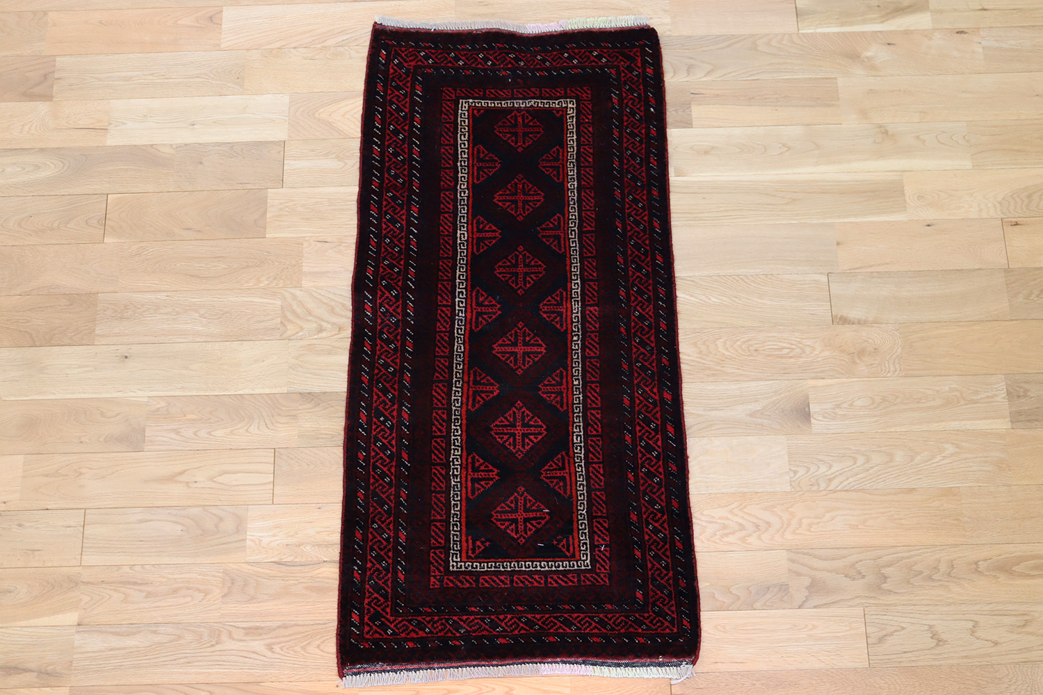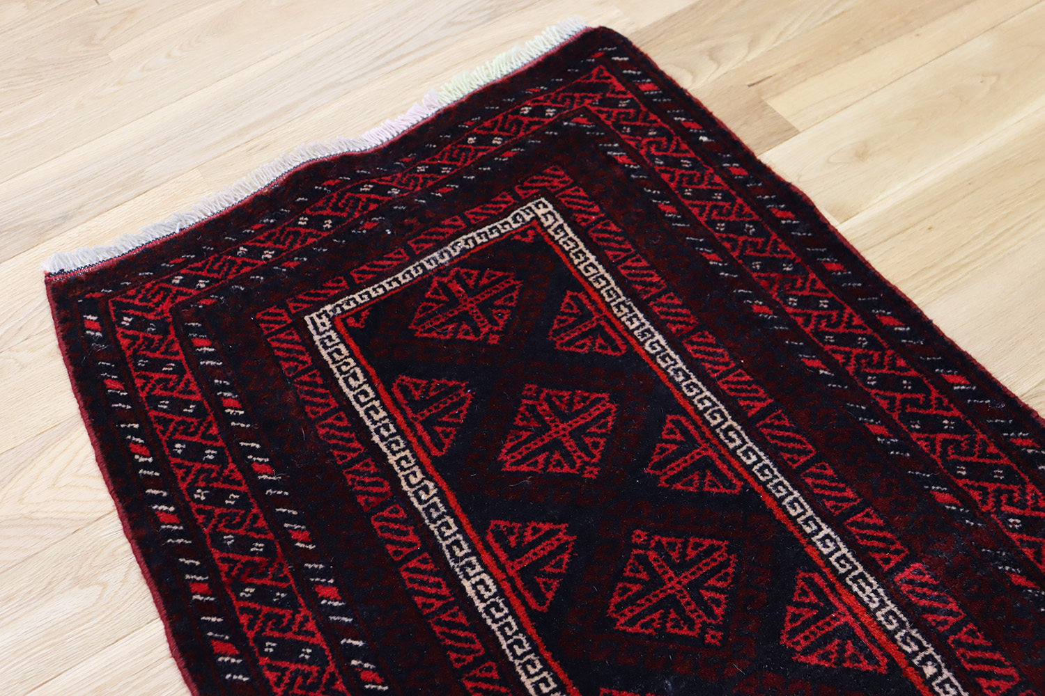 深い赤と黒のコントラストが際立つ本作は、バルーチ絨毯の中でも特に伝統性が強く、遊牧民の文化を濃く映した魅力的な作品です。幾何学文様の力強さ、細密なボーダー、柔らかな質感、そのすべてがバルーチ織物の特徴を存分に表現しており、空間の印象を引き締めながら、異国情緒と品格を添えてくれます。