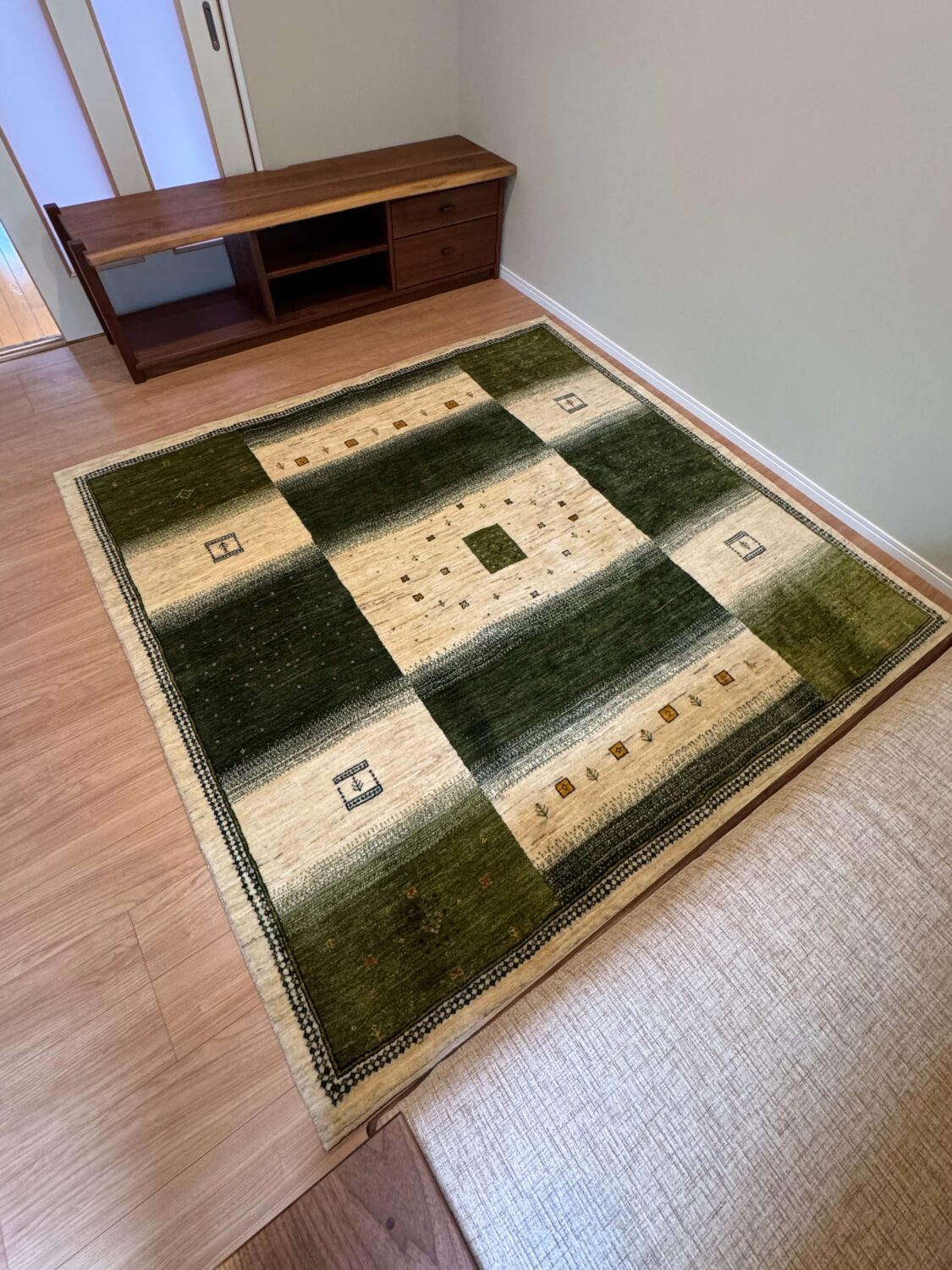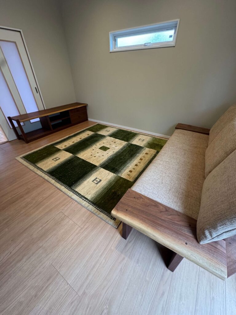 リフォーム後のリビングは、低めの家具でまとめられ、視線が自然と床へと落ちる構成。その中で2×2mというサイズ感は、空間の「面」をしっかりと受け止め、リビング全体の印象を安定させてくれます。ギャッベがあることで、空間に一体感が生まれ、くつろぎの質が一段と高まったように感じられました。