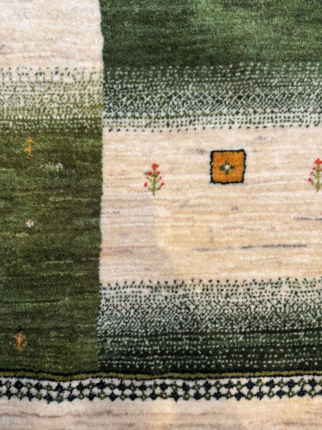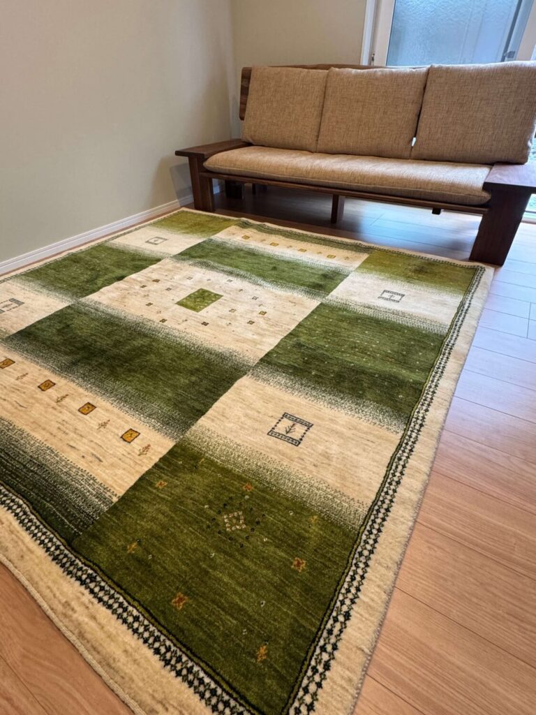 こちらのギャッベは、深みのあるグリーンと生成りを基調に、市松状に構成されたデザインが印象的な一枚。濃淡の異なるグリーンが使い分けられており単色でありながらも表情が豊かで、見る角度や光の入り方によって微妙に印象が変わります。まるで草原や大地を思わせるような、自然の広がりを感じさせる色合いです。